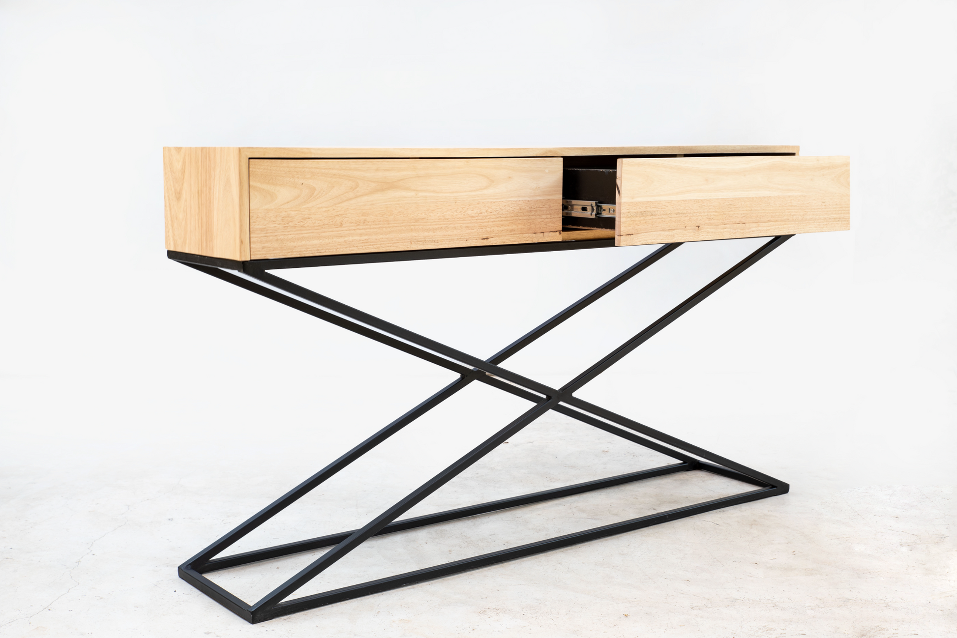 The Cross-Legged Console boasts a rubberwood drawer, treated with a water-based sealant to maintain its natural light hue and to offer protection against stains, wear, and moisture. Its stylish steel legs are finished with a powder coating, ensuring color durability and resistance to fading, chipping, and scratches.